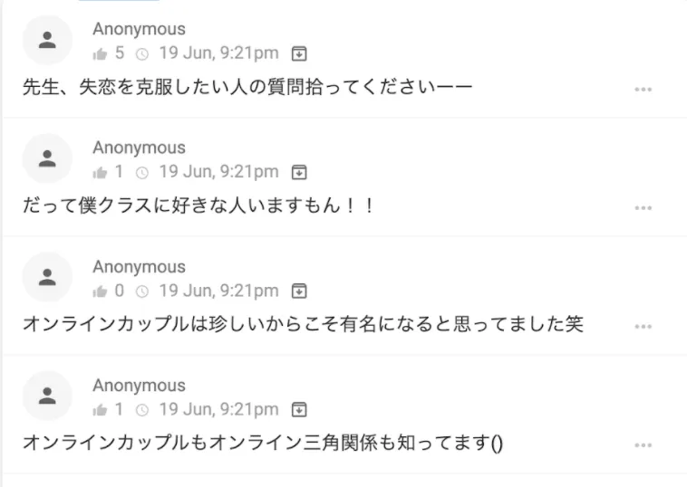 希望者だけで、6 月 19 日の夜 21:00 ~ 23:13 まで zoom に集まり、愚痴・政治・恋愛・映画といった様々なテーマで雑談をする会でした。Slido の投稿数は 1200 件にのぼり、その内容は「失恋の乗り越え方が分かりません」といったものから「常に気持ちが落ち込んでいて涙が出てきます」といったものまで多岐に渡りました。