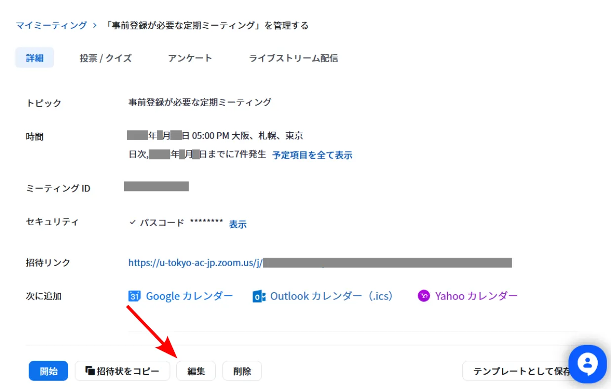 - 「定期的なウェビナーを編集」という画面が表示されます.「すべての定期開催を編集」ボタンを押してください.