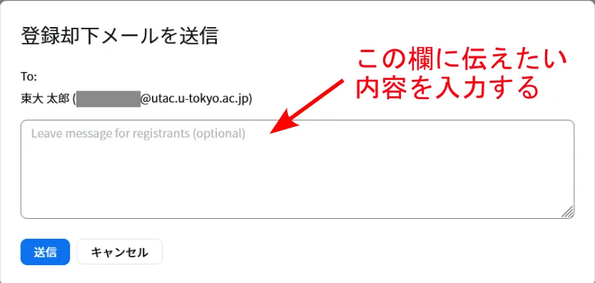 - 「登録却下メールを送信」という画面が表示されます.拒否した参加希望者に伝えたい内容を入力し,「送信」を押してください.ここで入力した内容が記載された登録却下メールを,拒否された参加希望者は受け取ります.